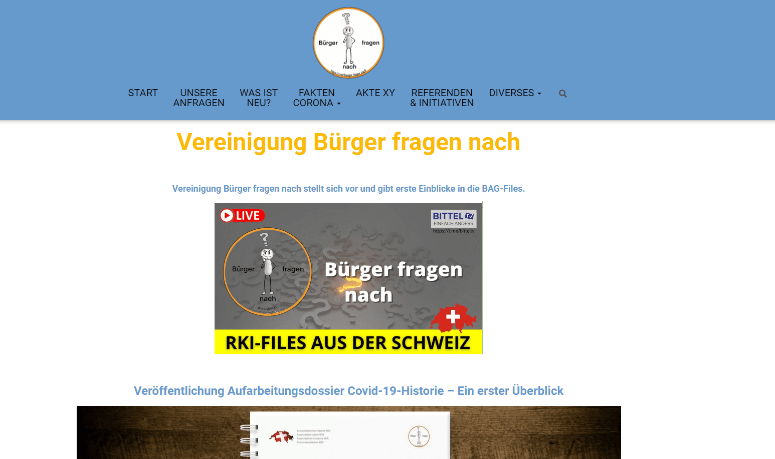 Wir «Bürger fragen nach» richten Fragen, welche uns und viele andere Bürger beschäftigen an staatliche Stellen, Behörden, Firmen oder an andere Mitbürger. Wir stellen dabei nicht nur zu Corona Fragen, wir stellen Fragen zu vielfältigen Themen, welche dringend geklärt und aufgearbeitet werden müssen. Aufklärung sehen wir als Schlüssel für eine freie Gesellschaft. Nur der, dem Wissen zur Verfügung steht, kann tatsächlich frei entscheiden. Wir regen zwar bestimmt, aber stets respektvoll zum offenen Diskurs an.