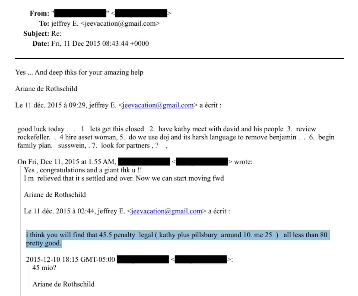 Wenige Tage später, am 4. Juni 2015, schrieb Rothschild an Epstein mit Informationen über einen konkurrierenden Vergleich: «I heard that the cousins paid 11.5mio to the Doj. Did u hear the same?» Mit «the cousins» («Ich habe gehört, dass die Cousins 11,5 Millionen an das DOJ gezahlt haben. Hast du dasselbe gehört?») ist offenbar ein anderer Zweig der Familie Rothschild gemeint, der einen eigenen Vergleich mit dem DOJ erzielt hatte. Rothschild betrieb einen Vergleich und nutzte Epstein als ihre primäre Informationsquelle in DOJ-Angelegenheiten, nicht nur für ihren eigenen Fall, sondern auch im Hinblick auf die verschiedenen rechtlichen Risiken innerhalb der Familie. (EFTA00686026)