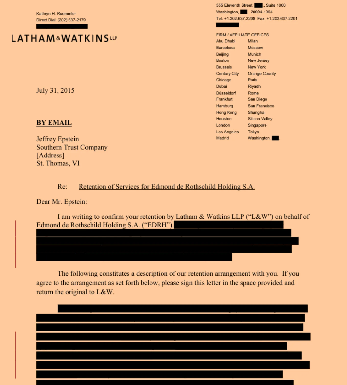 Die berufliche Beziehung beschränkte sich nicht auf informelle Koordination. Am 31. Juli 2015 sandte Kathryn Ruemmler, damals Partnerin bei Latham & Watkins LLP, Epstein ein formelles Mandatsschreiben, das seine Beauftragung als Berater im Namen von EDRH bestätigte (EFTA00582812). Das Schreiben, von Epstein unterzeichnet und von EDRH mit «reviewed and agreed» gegengezeichnet, war auf dem Briefpapier von Latham & Watkins verfasst und direkt an Epstein bei der Southern Trust Company in St. Thomas adressiert. Ruemmler schloss mit den Worten: «Thank you very much for agreeing to act as a consultant in this matter.» («Vielen Dank, dass du dich bereit erklärt hast, in dieser Angelegenheit als Berater zu fungieren.») Epstein war kein Kontakt, den sie übernommen hatte. Er war jemand, den sie formell mandatierte.