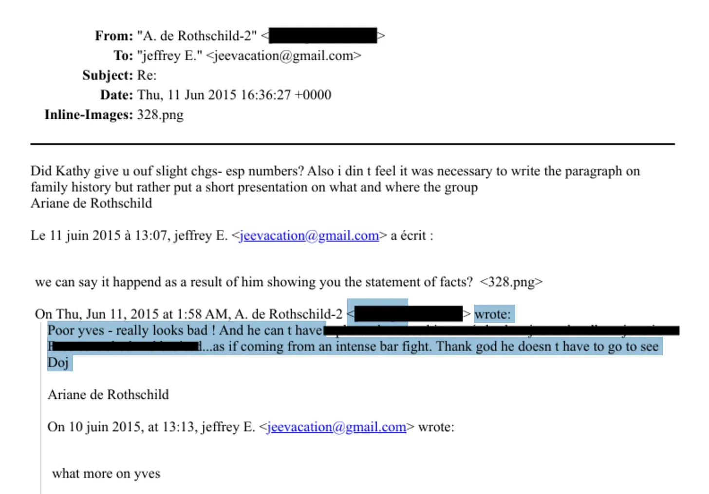 Die E-Mails vom Juni 2015 sind besonders aufschlussreich hinsichtlich Epsteins aktiver Rolle. Am 11. Juni 2015 beschrieb Rothschild Yves als körperlich gezeichnet, «really looks bad … as if coming from an intense bar fight. Thank god he doesn’t have to go to see Doj.» («Er sieht wirklich schlimm aus … als käme er aus einer heftigen Kneipenschlägerei. Gott sei Dank muss er nicht zum DOJ.») Epstein schlug umgehend eine Darstellung vor: «we can say it happened as a result of him showing you the statement of facts?» («Wir können sagen, es sei passiert, als er dir die Statement of Facts gezeigt hat?») Er regte an, Yves’ Zustand auf den emotionalen Schock beim Anblick der formellen Feststellungen des DOJ zurückzuführen, also eine Erklärung vorzuschlagen, die entsprechend kommuniziert werden könnte. (EFTA00708380).