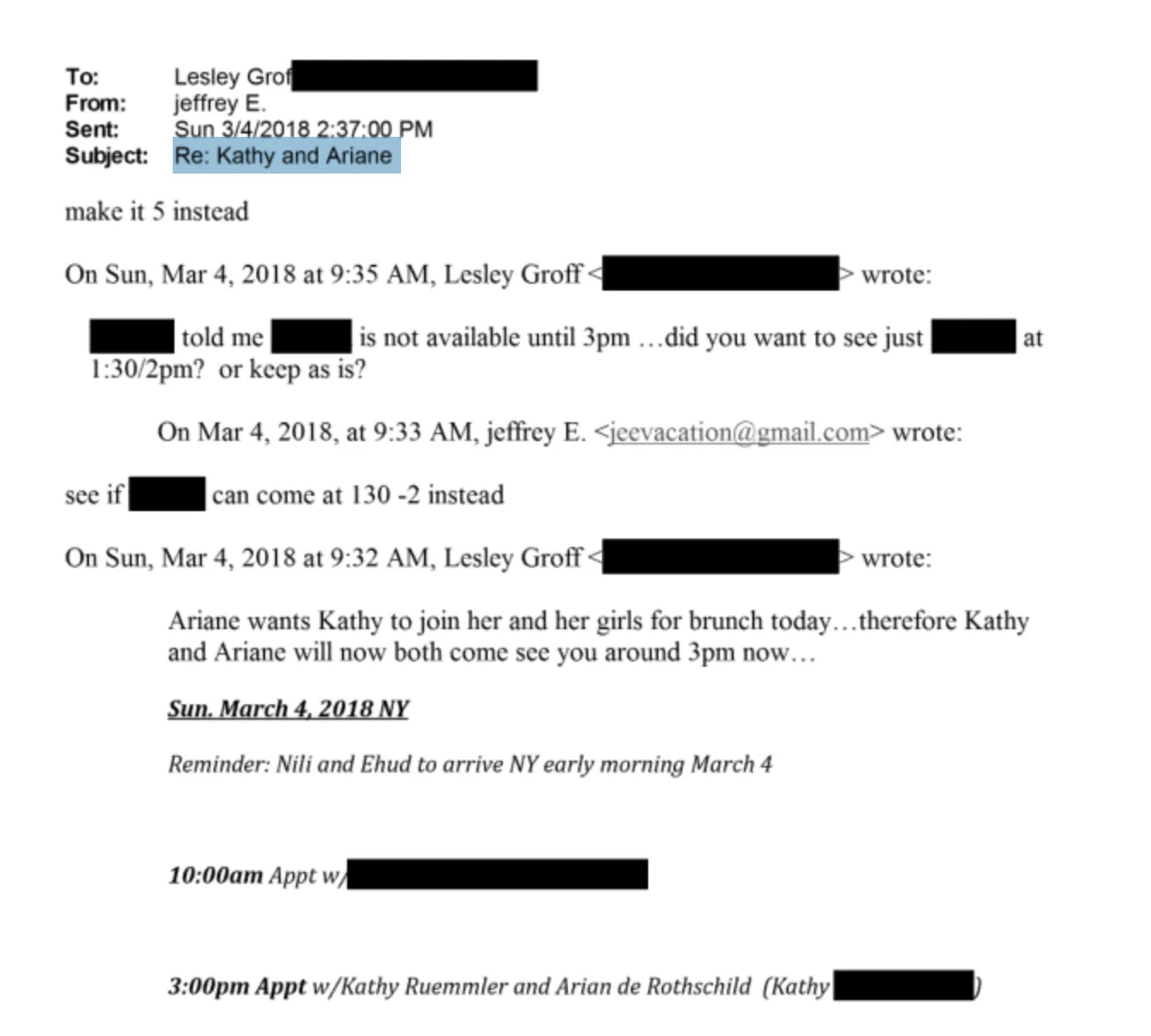 Der Termin vom 4. März wird durch eine separate E-Mail-Korrespondenz bestätigt, in der Groff schrieb: «Ariane wants Kathy to join her and her girls for brunch today…therefore Kathy and Ariane will now both come see you around 3pm now.» («Ariane möchte, dass Kathy heute mit ihr und ihren Mädchen zum Brunch kommt … daher werden Kathy und Ariane nun beide gegen 15 Uhr zu dir kommen.») (EFTA02239107) Die Betreffzeile lautete schlicht: «Kathy and Ariane.»