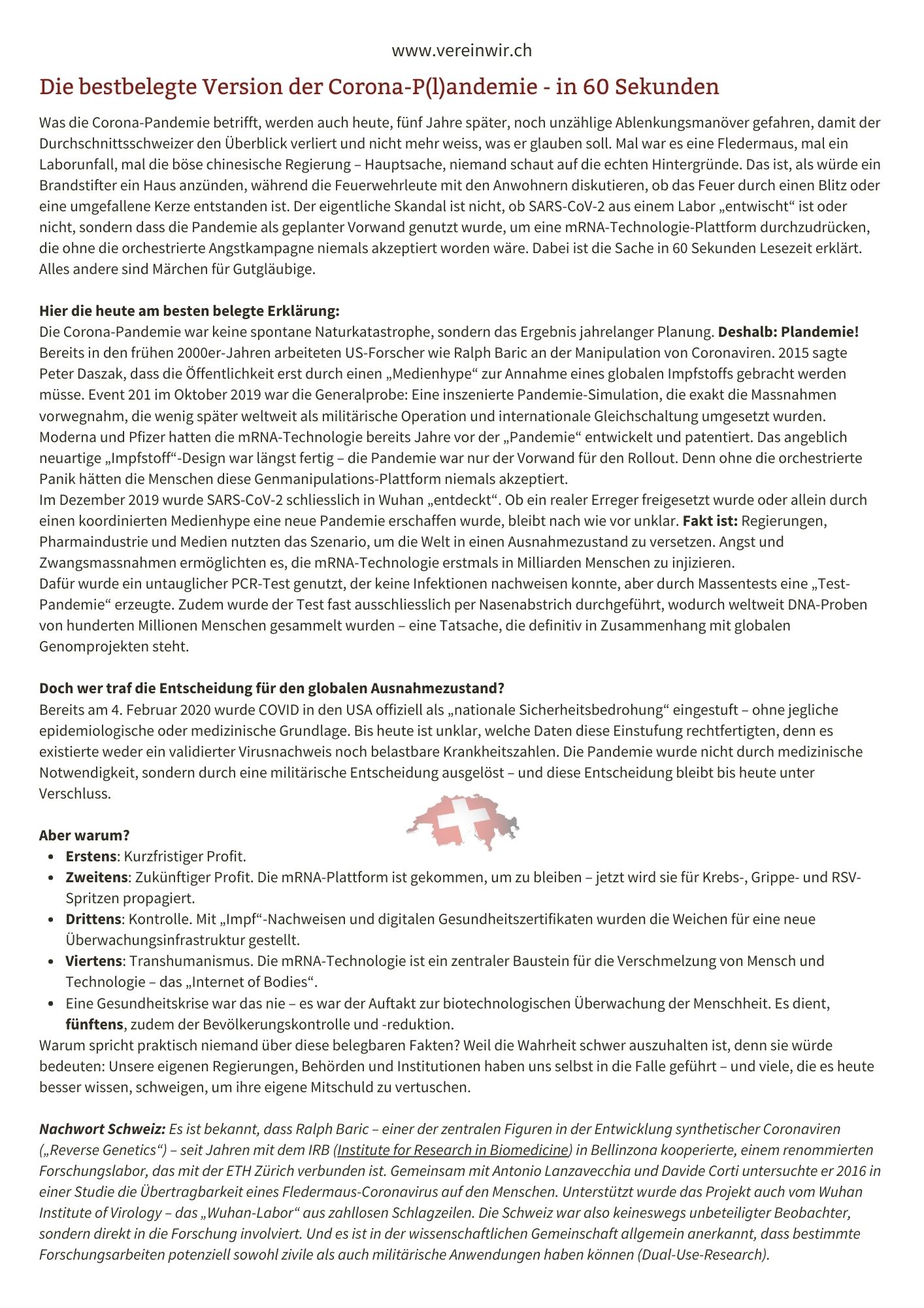 Was die Corona-Pandemie betrifft, werden auch heute, fünf Jahre später, noch unzählige Ablenkungsmanöver gefahren, damit der Durchschnittsschweizer den Überblick verliert und nicht mehr weiss, was er glauben soll. Mal war es eine Fledermaus, mal ein Laborunfall, mal die böse chinesische Regierung – Hauptsache, niemand schaut auf die echten Hintergründe. Das ist, als würde ein Brandstifter ein Haus anzünden, während die Feuerwehrleute mit den Anwohnern diskutieren, ob das Feuer durch einen Blitz oder eine umgefallene Kerze entstanden ist. Der eigentliche Skandal ist nicht, ob SARS-CoV-2 aus einem Labor „entwischt“ ist oder nicht, sondern dass die Pandemie als geplanter Vorwand genutzt wurde, um eine mRNA-Technologie-Plattform durchzudrücken, die ohne die orchestrierte Angstkampagne niemals akzeptiert worden wäre. Dabei ist die Sache in 60 Sekunden Lesezeit erklärt. Alles andere sind Märchen für Gutgläubige.