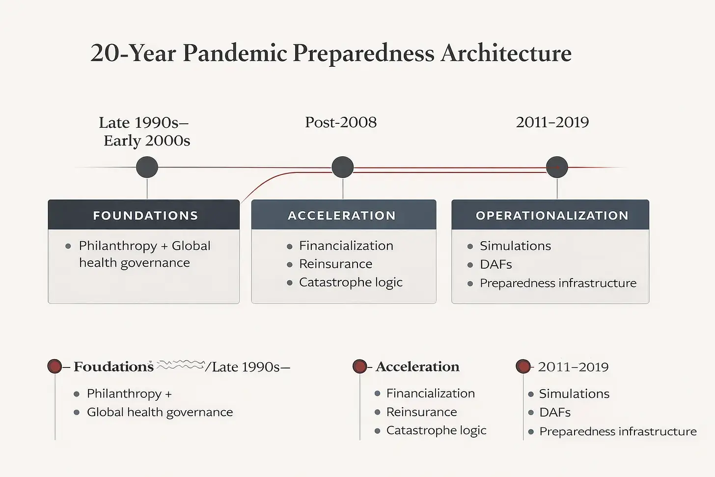 Während die Epstein-Files die Aufmerksamkeit erneut auf einzelne Beziehungen gelenkt haben, liegt ihre tiefere Bedeutung darin, wie sie sich mit einer wesentlich längeren und bislang kaum untersuchten Entwicklungslinie überschneiden. Öffentliche Aufzeichnungen, institutionelle Initiativen und Finanzinstrumente deuten darauf hin, dass die konzeptionellen Grundlagen der Pandemie-Vorsorge als gemanagte finanzielle und sicherheitspolitische Kategorie bereits Ende der 1990er- und Anfang der 2000er-Jahre Gestalt annahmen, als philanthropisches Kapital, globale Gesundheits-Governance und Risikofinanzierung zunehmend zusammenwuchsen. Nach der Finanzkrise von 2008 beschleunigte sich dieses Rahmenwerk rasant: Es dehnte sich über Rückversicherungsmärkte, parametrische Trigger, Donor-Advised-Finanzierungsstrukturen und globale Simulationen aus, Jahre bevor COVID-19 diese Architektur für die Öffentlichkeit sichtbar machte.