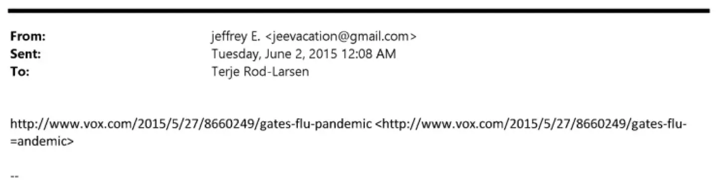 Drei Monate später, am 2. Juni 2015, leitete Epstein Rød-Larsen einen Vox-Artikel über Bill Gates und die Vorbereitung auf Grippepandemien weiter, ohne Kommentar, lediglich den Link. Die URL lautet: vox.com/2015/5/27/8660249/gates-flu-pandemic.