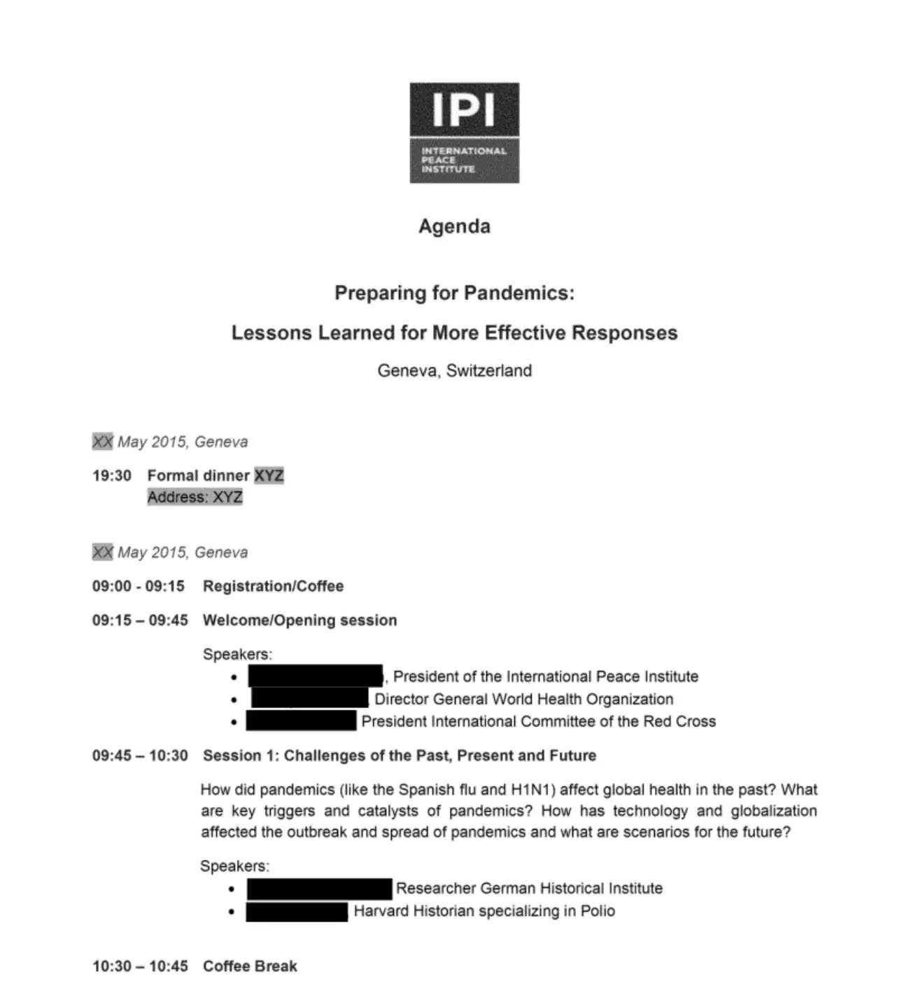 Der Vorschlag blieb nicht theoretisch. Im Mai 2015 berief das International Peace Institute in Genf ein hochrangiges Treffen unter Ausschluss der Öffentlichkeit ein, mit dem Titel «Preparing for Pandemics: Lessons Learned for More Effective Responses». Die Agenda zeigt eine Bündelung institutioneller Macht, wie sie ausserhalb offiziell erklärter Krisen selten zusammenkommt: der Generaldirektor der Weltgesundheitsorganisation, der Präsident der Weltbank, der Präsident des Internationalen Komitees vom Roten Kreuz, der internationale Präsident von Médecins Sans Frontières sowie hochrangige Vertreter der Vereinten Nationen und der globalen Gesundheitsverwaltung.