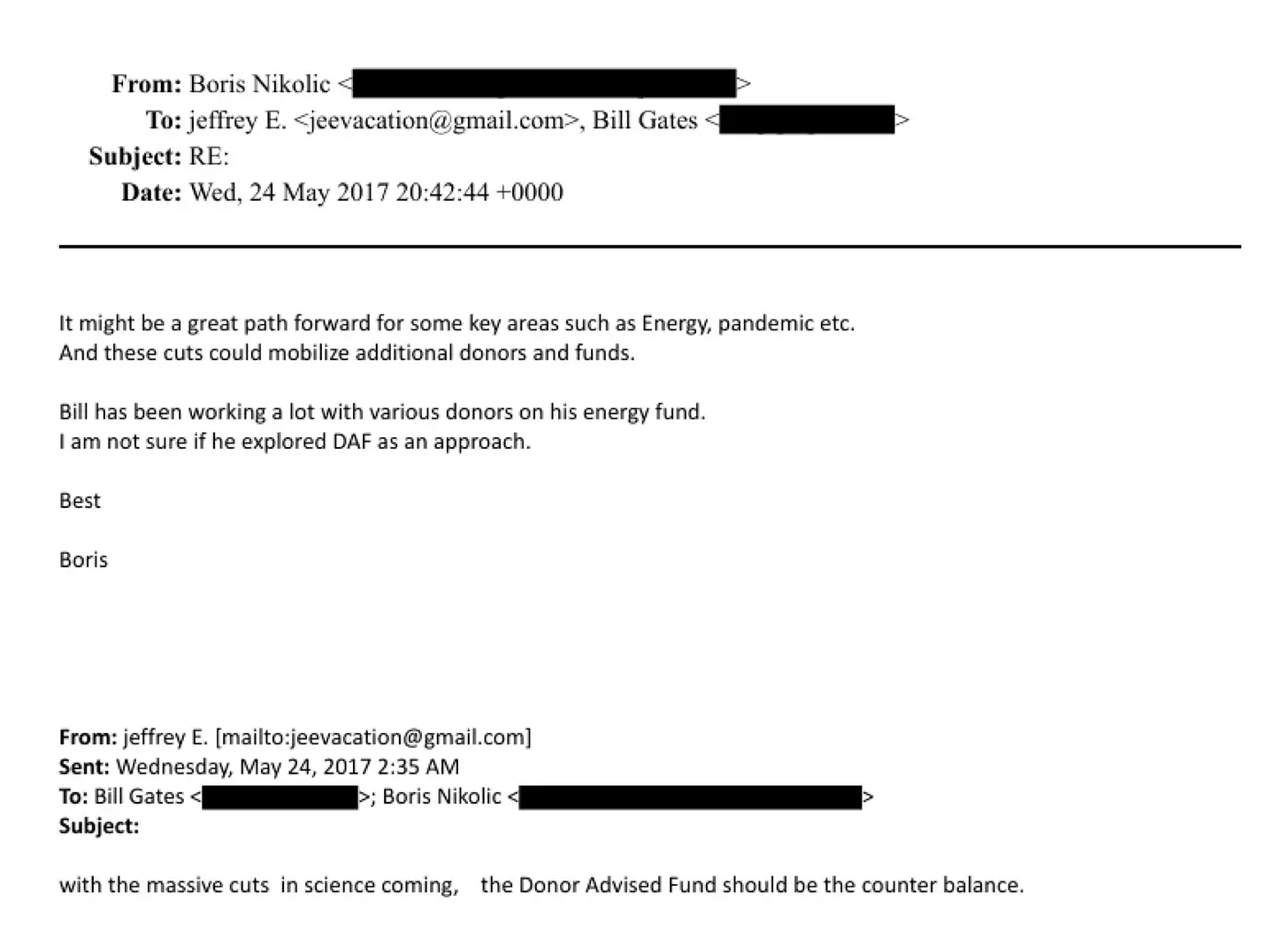 - Jeffrey Epstein, Bill Gates und Boris Nikolic. E-Mail-Thread zu DAFs als Gegenbalance. 24. Mai 2017. (EFTA00697005)