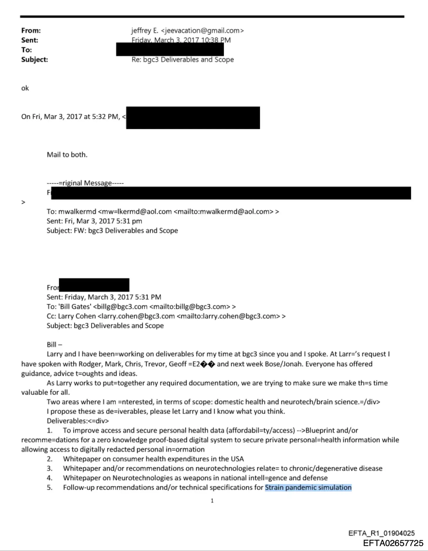 Zwei Monate später, im März 2017, umreisst eine separate E-Mail mit dem Titel «bgc3 Deliverables and Scope» die geplanten Arbeiten für bgC3, das private strategische Büro von Bill Gates. Das Dokument listet Deliverables in mehreren Bereichen auf: nationale Gesundheit, Infrastruktur für persönliche Gesundheitsdaten, Neurotechnologie, Hirnforschung sowie, ohne besondere Hervorhebung aufgeführt: