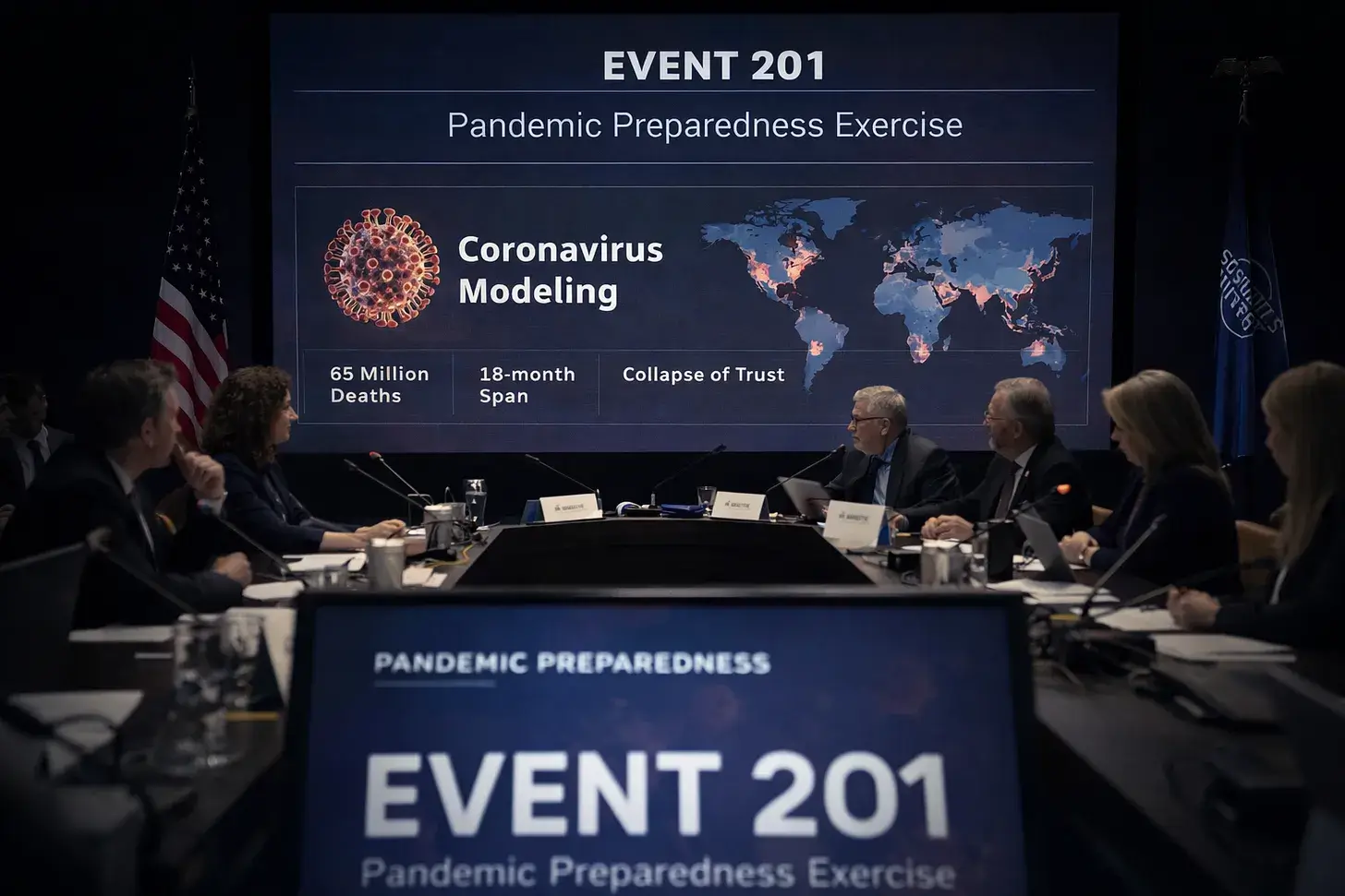 Am 18. Oktober 2019, sechs Wochen vor den ersten öffentlich bestätigten COVID-19-Fällen, veranstalteten das Johns Hopkins Center for Health Security, das World Economic Forum und die Bill & Melinda Gates Foundation gemeinsam Event 201, eine hochrangige Pandemie-Simulationsübung mit einem neuartigen Coronavirus.