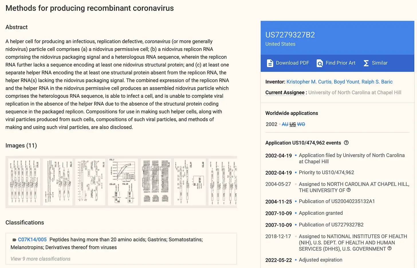 Die Patentspur an der University of North Carolina ist noch älter. Ralph Baric reichte im April 2002 sein erstes Patent zu Verfahren zur Herstellung rekombinanter Coronaviren ein (US-Patent Nr. 7,279,327). Im März 2015 meldeten Baric und Kollegen eine internationale Patentanmeldung für chimäre Coronavirus-Spike-Proteine an (PCT/US2015/021773), die im Februar 2018 als US-Patent Nr. 9,884,895 erteilt wurde und unter dem NIH-Förderprogramm U54AI057157 finanziert war. Barics jahrzehntelange, durch die NIH finanzierte Coronavirus-Forschung, einschliesslich Gain-of-Function-Arbeiten an Spike-Protein-Konstrukten, brachte Fähigkeiten hervor, die lange vor 2020 umfangreich in begutachteter Fachliteratur und in Patentunterlagen dokumentiert waren.