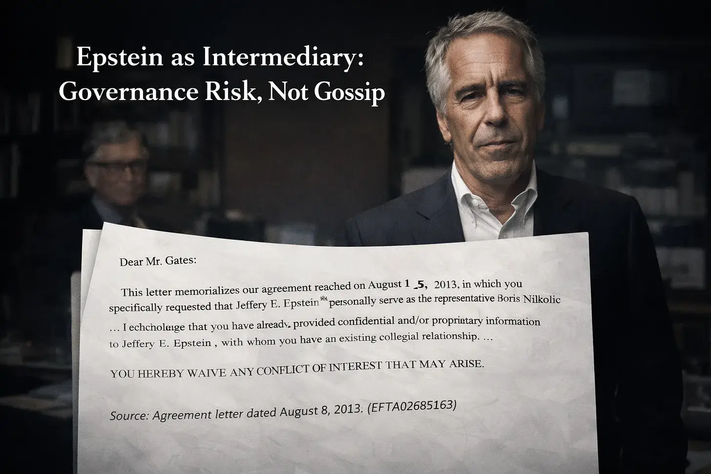 Das Problem besteht nicht allein darin, dass Epstein beteiligt war. Entscheidend ist, dass Institutionen mit unbegrenzten Ressourcen ihn wiederholt als Intermediär auswählten, trotz seiner Verurteilung, obwohl zahlreiche Alternativen zur Verfügung standen. JPMorgan verfügte über Tausende von Vermögensberatern. Die Gates Foundation beschäftigte über 1.500 Mitarbeitende. Boris Nikolic hätte jede beliebige Kanzlei im Land beauftragen können. Sie entschieden sich für Epstein, und sie entschieden sich Jahr für Jahr erneut für ihn, von 2011 bis mindestens 2017. Dieses Muster weist auf ein Versagen der Governance hin, nicht auf einen Zufall.