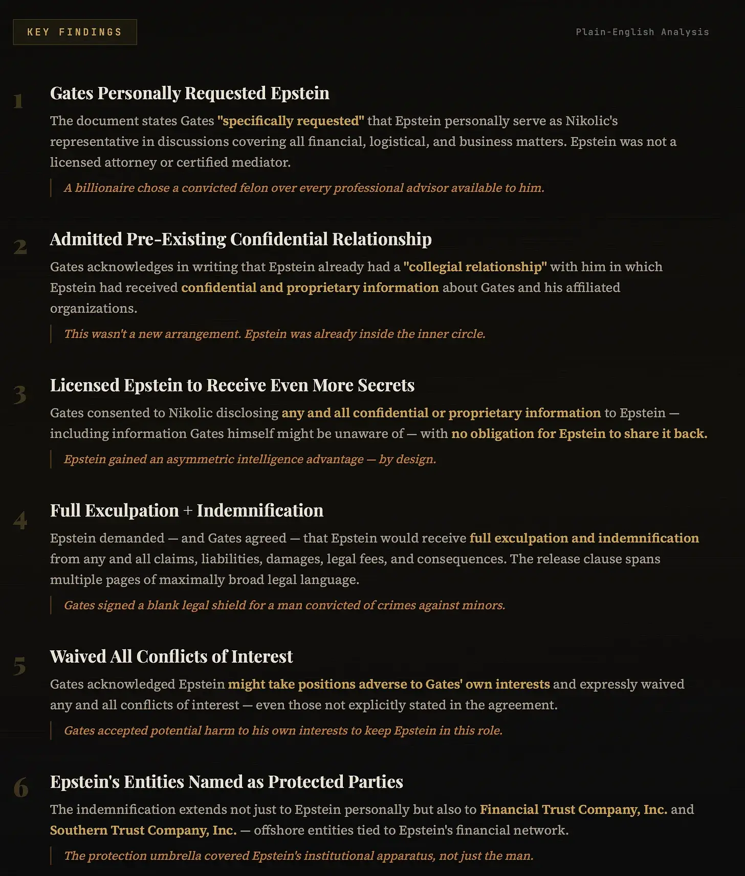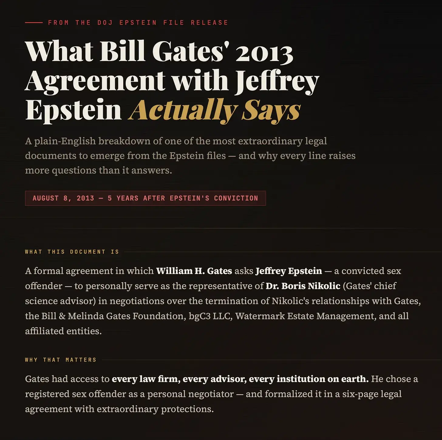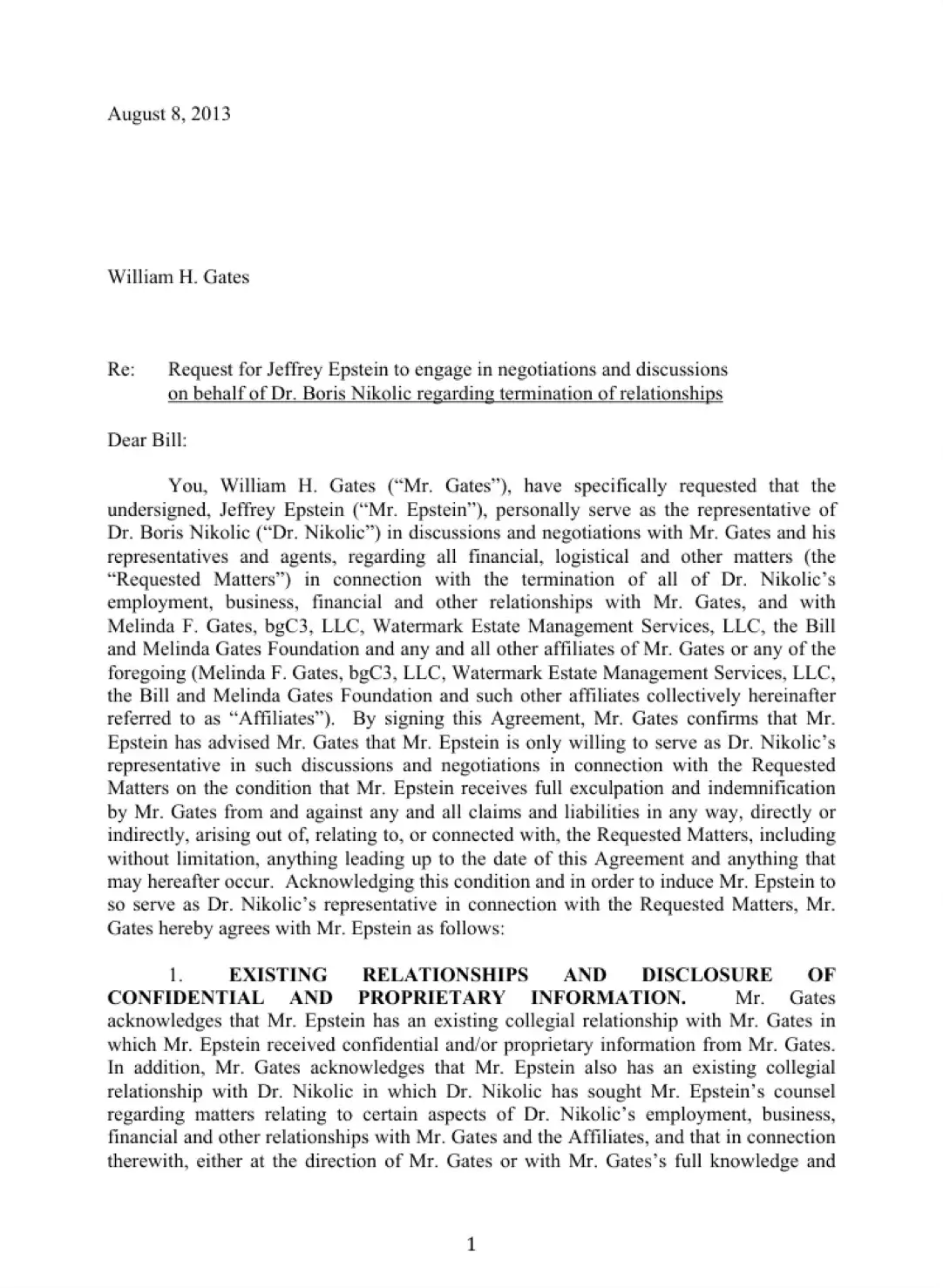 In dem Schreiben heißt es, dass Gates „ausdrücklich darum gebeten“ habe, dass Jeffrey Epstein in bestimmten finanziellen und logistischen Verhandlungen „persönlich als Vertreter“ von Boris Nikolic fungiere. Es wird bestätigt, dass Epstein eine „bestehende kollegiale Beziehung“ zu Gates hatte, in deren Rahmen Epstein bereits „vertrauliche und/oder geschützte Informationen“ erhalten hatte. Gates verzichtet auf Interessenkonflikte und gewährt eine umfassende Entschädigung.