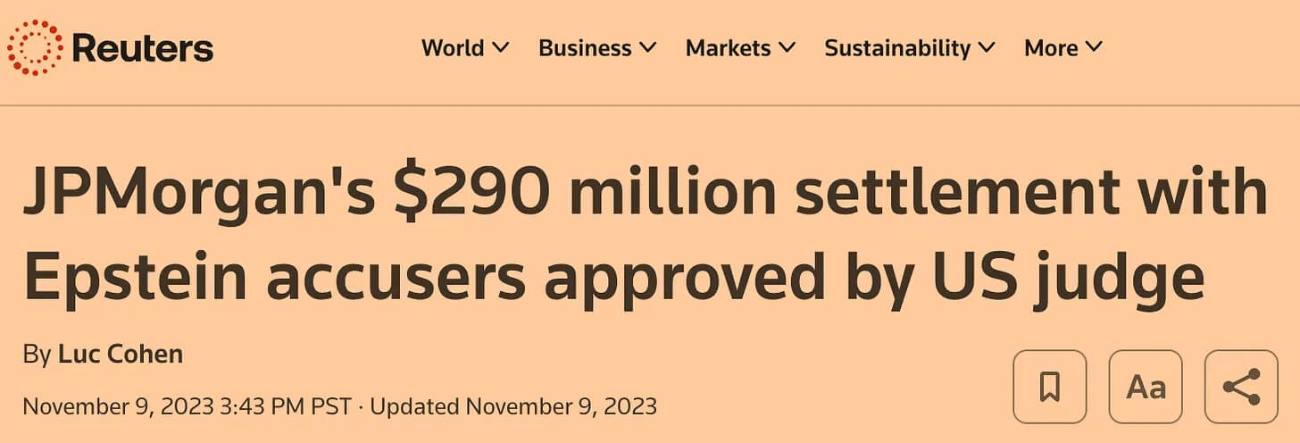 Quelle: Reuters, «U.S. judge approves JPMorgan’s $290 million settlement with Epstein accusers», 9. November 2023.