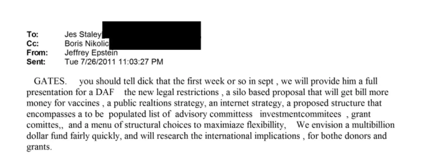 Fünf Monate später, im Juli 2011, sandte Epstein eine interne E-Mail an Jes Staley. Nun war auch Boris Nikolic, Bill Gates’ Chefberater für Wissenschaft und Technologie, in Kopie gesetzt. Die E-Mail beschreibt den geplanten Donor-Advised Fund in weiter entwickelten Begriffen. In der operativen Sprache verborgen findet sich ein Satz, den man zweimal lesen sollte: