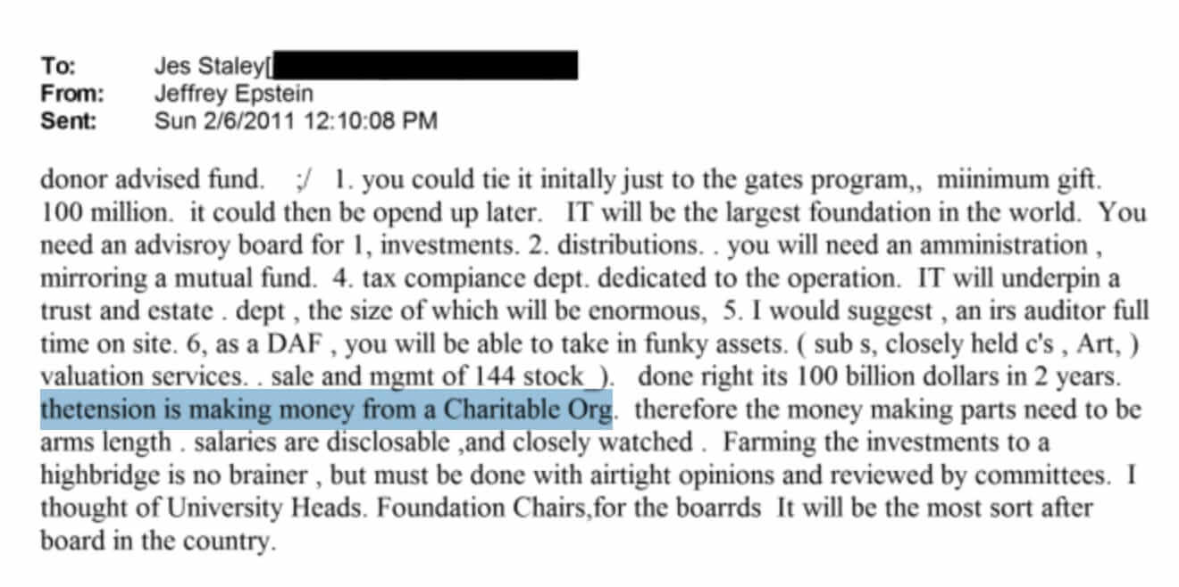 Elf Tage später, am 28. August 2011, sandte Epstein eine Folge-E-Mail an Staley und Erdoes, in der er das Konzept des Donor-Advised Fund noch detaillierter darlegte. Die von ihm beschriebene Struktur ist kein typisches wohltätiges Vehikel. Es handelt sich um eine Finanzplattform.