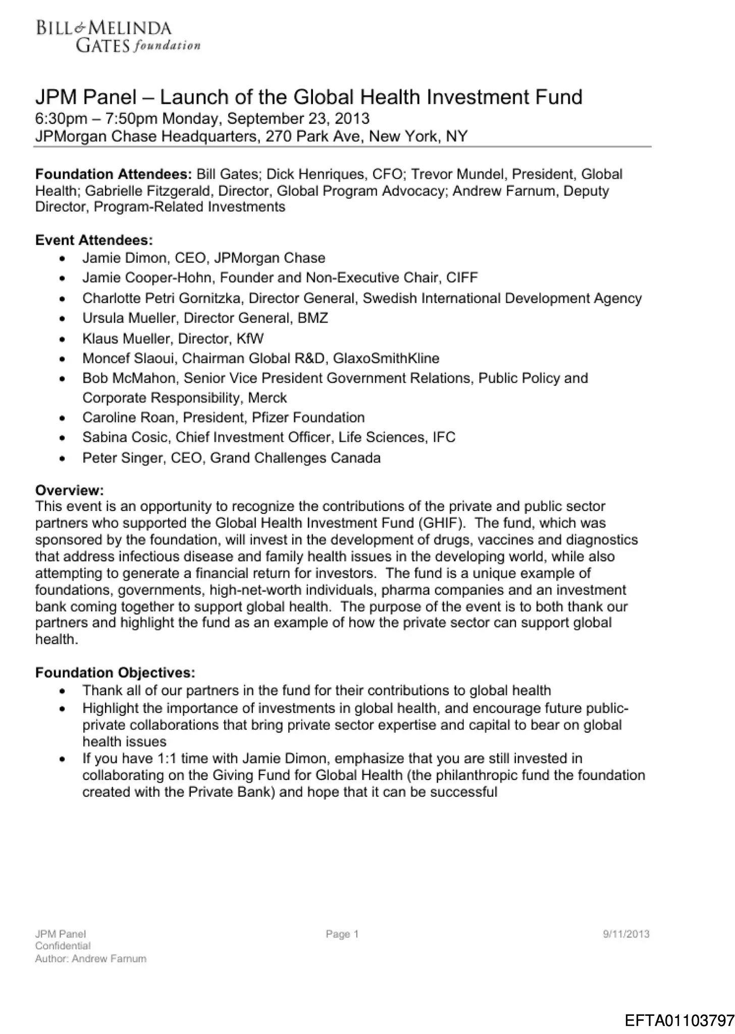 Ein vertrauliches, 15-seitiges Briefing, das für ein von JPMorgan ausgerichtetes Panel am 23. September 2013 erstellt wurde, beschreibt den Global Health Investment Fund als «the first investment fund focused on global health drug and vaccine development» („Der erste Investmentfonds, der sich auf die Entwicklung von Arzneimitteln und Impfstoffen für die globale Gesundheit konzentriert“).