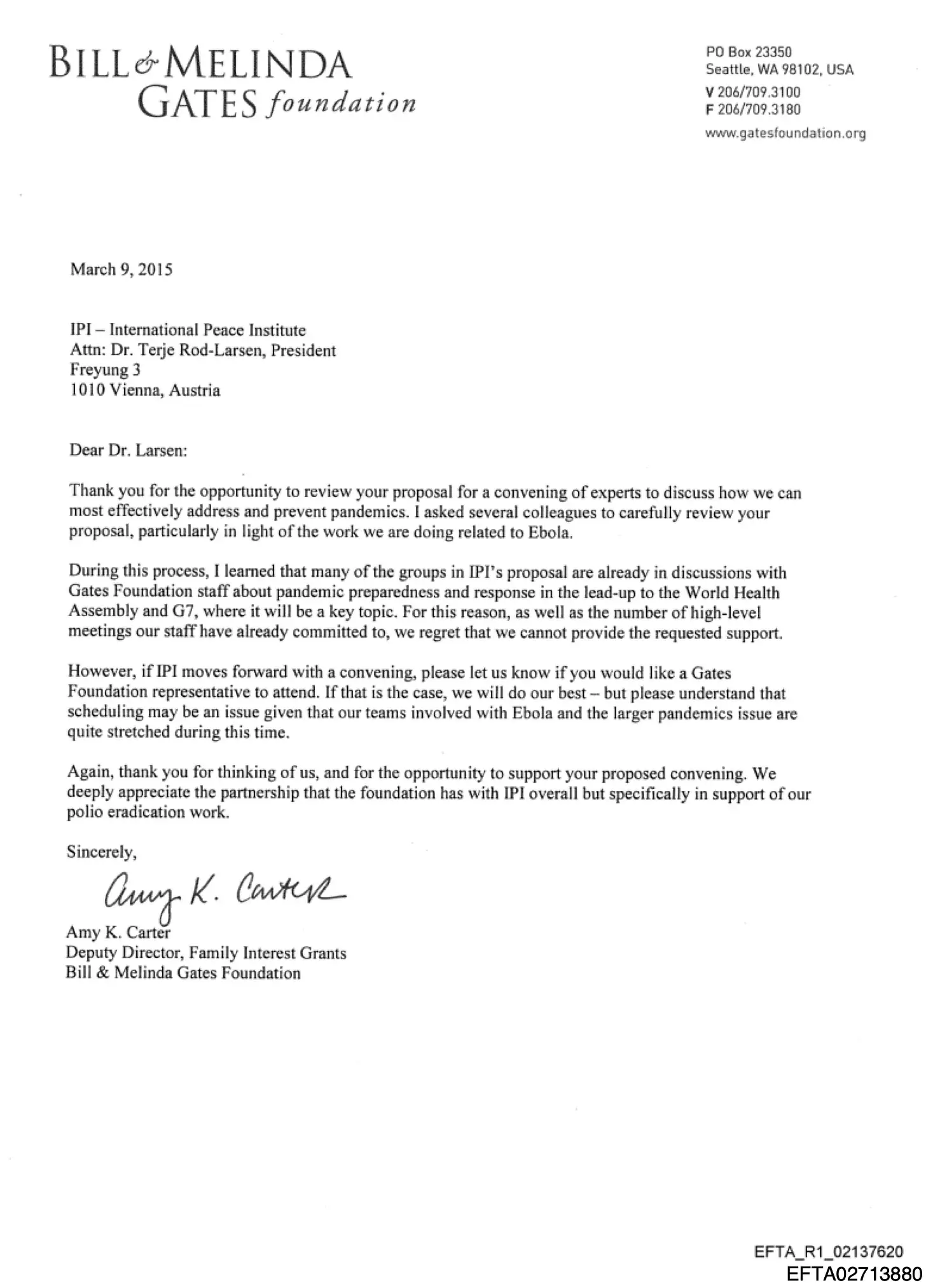 - Bill & Melinda Gates Foundation (Amy K. Carter) an Dr. Terje Rød-Larsen, International Peace Institute. Schreiben betreffend Pandemie-Vorsorge-Treffen. 9. März 2015. (EFTA02713880 / EFTA_R1_02137620)