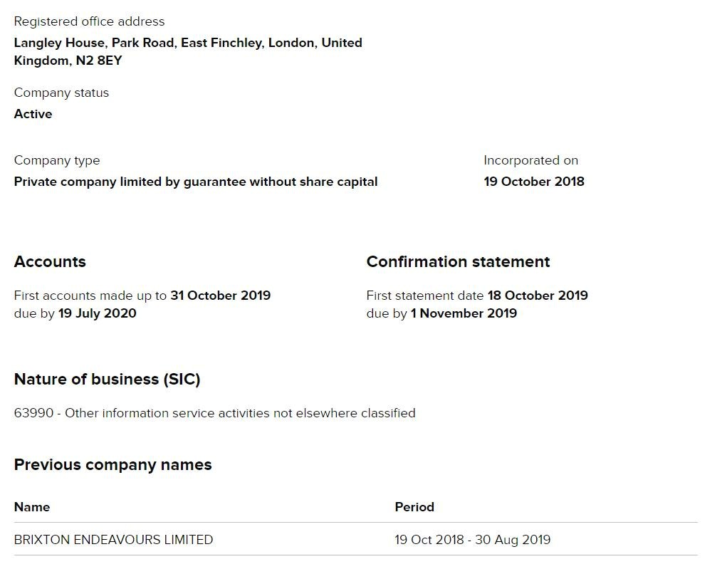 Am 19. Oktober 2018 wurde bei Companies House eine Gesellschaft unter dem Namen Brixton Endeavours Limited eingetragen. Ihr einziger Direktor war Morgan McSweeney. Ihre Adresse war identisch mit jener von Labour Together.