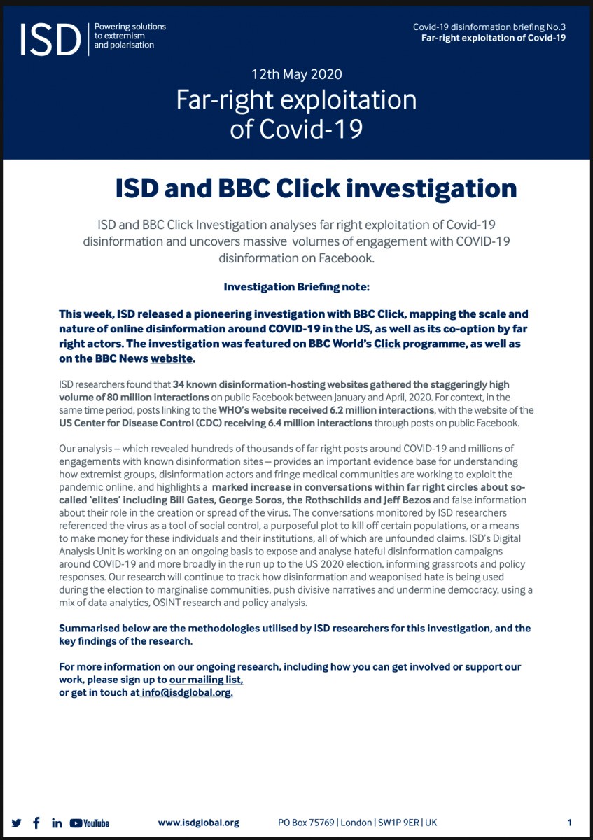 Der ISD-Bericht stufte die Diskussion von Themen wie der Rolle von Bill Gates oder George Soros in der Pandemiepolitik oder den finanziellen Interessen von Pharmaunternehmen als «rechtsextremen Extremismus» ein, obwohl zu den Geldgebern von ISD ausgerechnet jene Personen gehörten, deren Rollen diskutiert wurden.