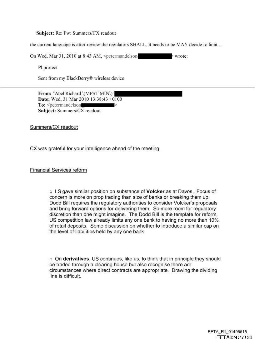 Am 31. März 2010 sandte Mandelsons leitender Privatsekretär ihm eine Notiz über ein Treffen zwischen dem Schatzkanzler und Larry Summers, dem damaligen US-Finanzminister (EFTA_R1_01496514). Das Protokoll mit dem Titel «Summers/CX readout» enthielt detaillierte Informationen zur Volcker-Regel, zur Ausarbeitung von Dodd Frank, zur Derivateregulierung, zu Vorschlägen für systemische Abgaben, zur Konsumentenfinanzregulierung sowie zur Frage, wie die USA europäische Verbündete in die Finanzreform einbinden sollten. Es begann mit dem Satz: «CX was grateful for your intelligence ahead of the meeting». „CX war dankbar für Ihre Informationen im Vorfeld des Treffens.“