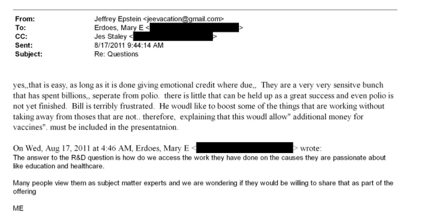 Hier entwirft ein wegen Sexualverbrechen an Minderjährigen verurteilter Mann explizit ein Finanzvehikel zur Gewinnerzielung unter dem rechtlichen Deckmantel der Wohltätigkeit und coacht gleichzeitig Wall Street Führungskräfte darin, mit den Frustrationen eines Milliardärs umzugehen. Wie Epstein im selben E Mail Strang schrieb:„Bill ist furchtbar frustriert … daher muss in der Präsentation erklärt werden, dass dadurch ‚zusätzliche Mittel für Impfstoffe‘ bereitgestellt werden können.“ Epstein machte keine Vorschläge. Er diktierte, was JPMorgan in seiner Präsentation an Gates zwingend zu sagen hatte.