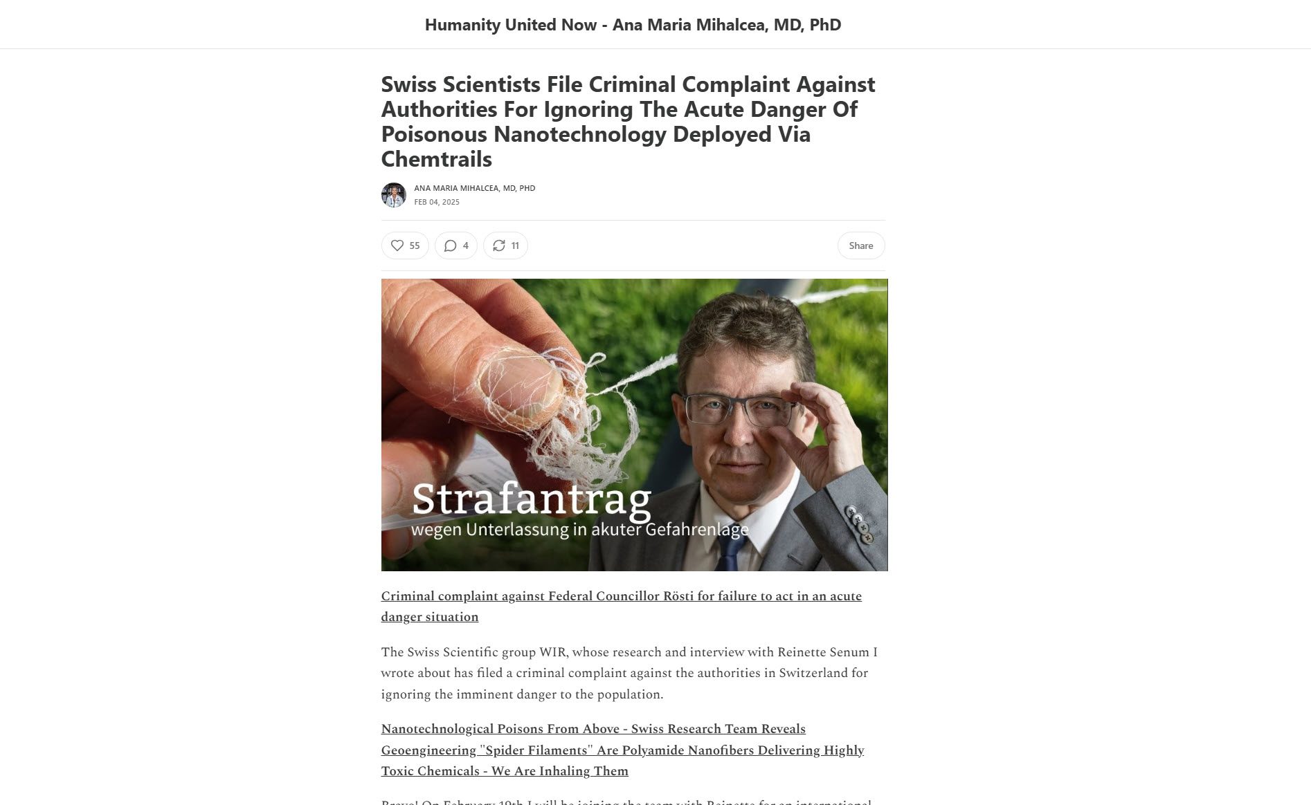 The Swiss Scientific group WIR, whose research and interview with Reinette Senum I wrote about has filed a criminal complaint against the authorities in Switzerland for ignoring the imminent danger to the population.