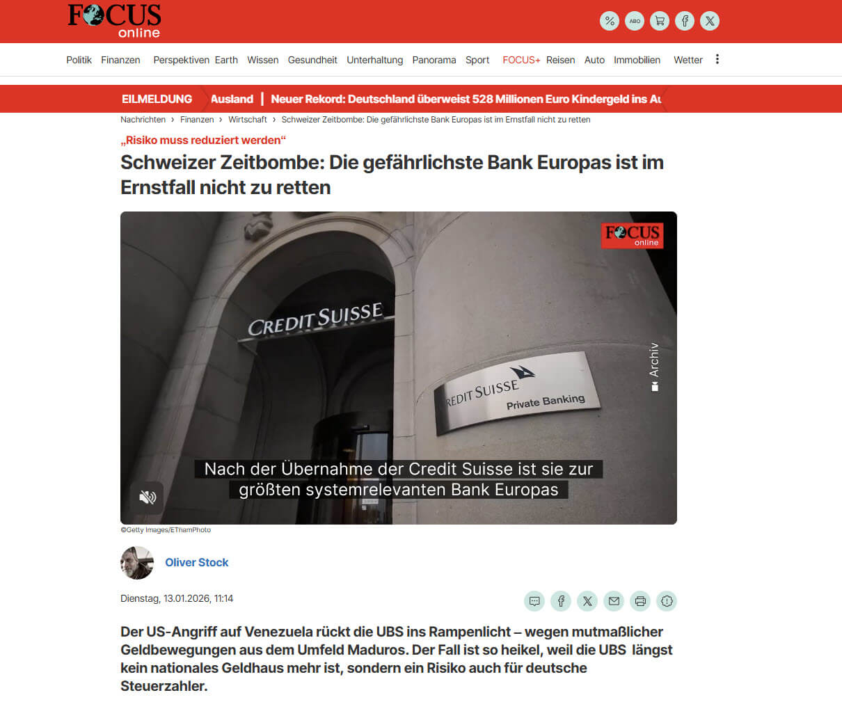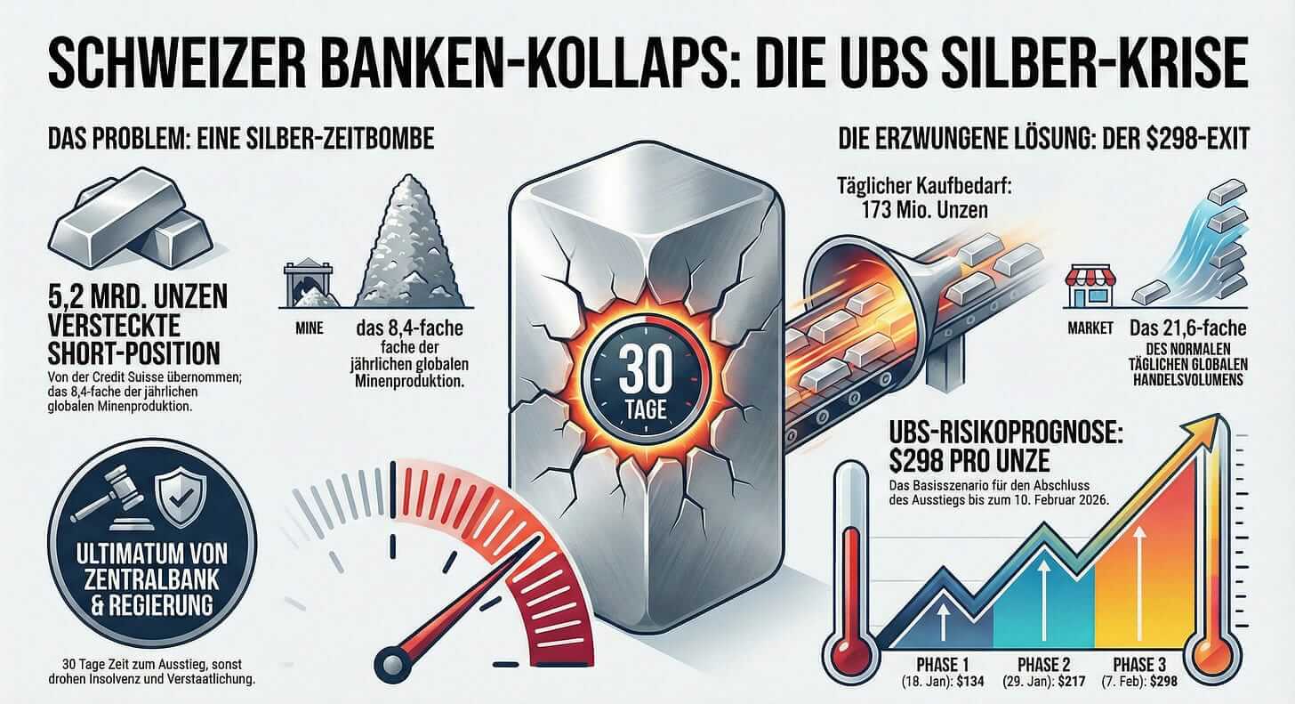 Der „Silber-Schock“ ist real. Er ist das Symptom einer geopolitischen Neuordnung, in der Rohstoffe (Commodities) wieder als strategische Waffen bewertet werden. Die USA haben dies erkannt (Venezuela/Tennessee). Banken, die noch immer auf Papiermodelle setzen (Shorts), stehen vor existenzbedrohenden Verlusten. In diesem Licht erscheint die Panik um die UBS nicht als Desinformation, sondern als verfrühte Warnung vor einem Ereignis, das durch staatliche Intervention (Bailout/Nationalisierung) möglicherweise noch verschleiert, aber nicht verhindert werden kann.