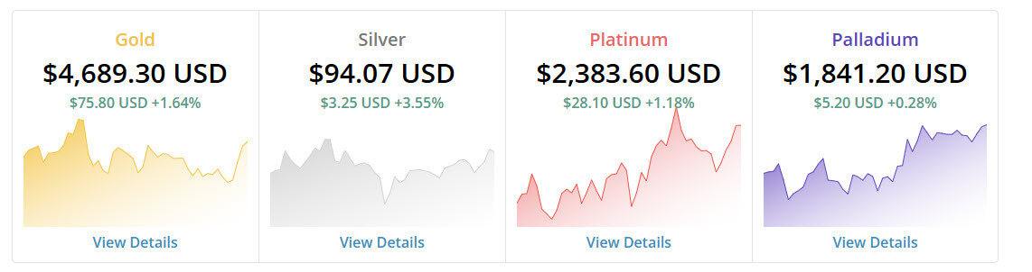 Live Gold, Silver, Platinum, and Palladium Spot Prices – 19.1.2026, 13.40 Uhr (Apmex)