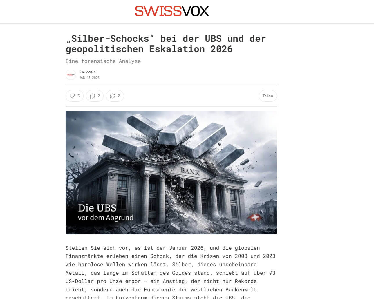 Die Veröffentlichung unseres Beitrags zur Lage der UBS und den Verwerfungen am Silbermarkt hat eine breite öffentliche Reaktion ausgelöst. Neben Zustimmung erreichten uns kritische Rückmeldungen von Journalisten, Ökonomen und Marktbeobachtern, die unsere Einschätzungen als überzogen oder nicht glaubwürdig einordneten.