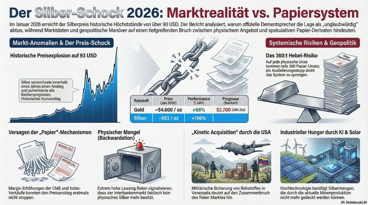 Der Januar 2026 markiert einen historischen Wendepunkt in der Geschichte der globalen Finanzmärkte, der in seiner Intensität und strukturellen Bedeutung die Krisen von 2008 und 2023 in den Schatten stellt. Im Zentrum dieser Dislokation steht der Silbermarkt, der mit einem Preisanstieg auf über 93 US-Dollar pro Unze nicht nur historische Höchststände durchbrochen, sondern auch die Integrität der westlichen Bankeninfrastruktur in Frage gestellt hat.