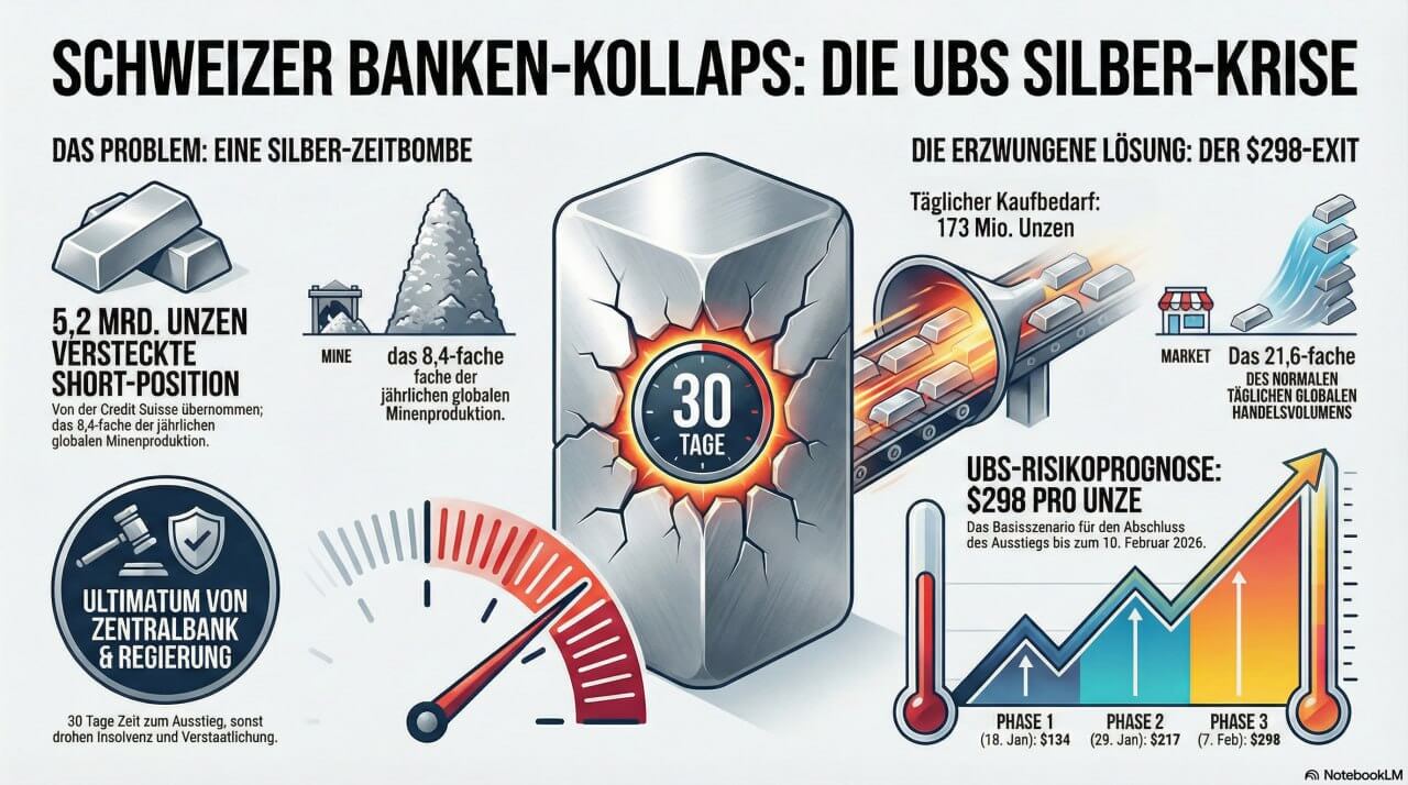 Die UBS hält derzeit eine Silber Short Position von zirka 5,2 Milliarden Feinunzen. Dies entspricht mehr als dem achtfachen der weltweiten Jahresproduktion und übersteigt das Kernkapital der Bank um über 200 Prozent. Auf Basis dieser Position ergibt sich ein buchhalterischer Verlust von rund 223 Milliarden Franken – die Bank ist damit allein durch ihr Silber Engagement bilanziell insolvent.