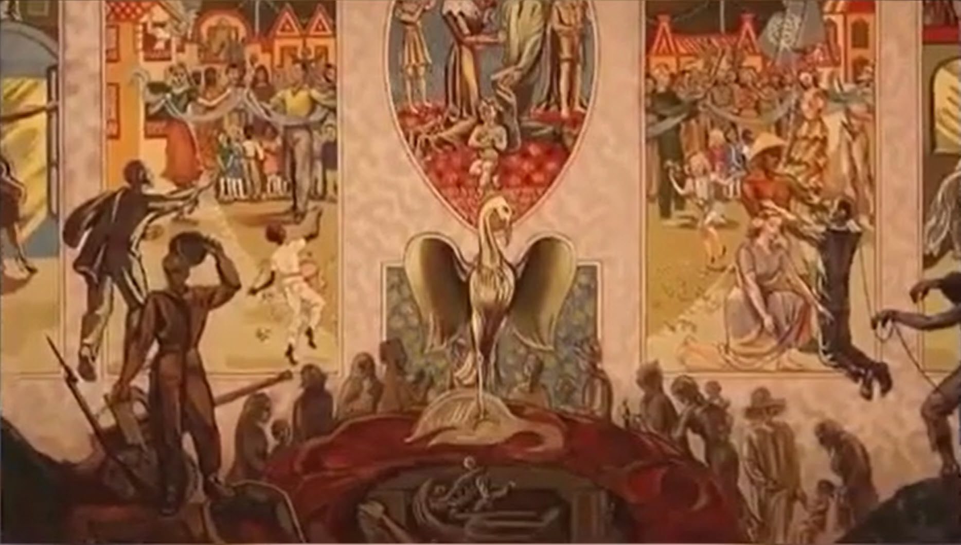Nur wenige Schritte entfernt, im Sitzungssaal des UN-Sicherheitsrats, hängt ein monumentales Wandbild. Offiziell zeigt es „Frieden nach dem Krieg“ – doch es steckt voller Symbole, die in esoterischen Kreisen als apokalyptischer Kodex gelten: