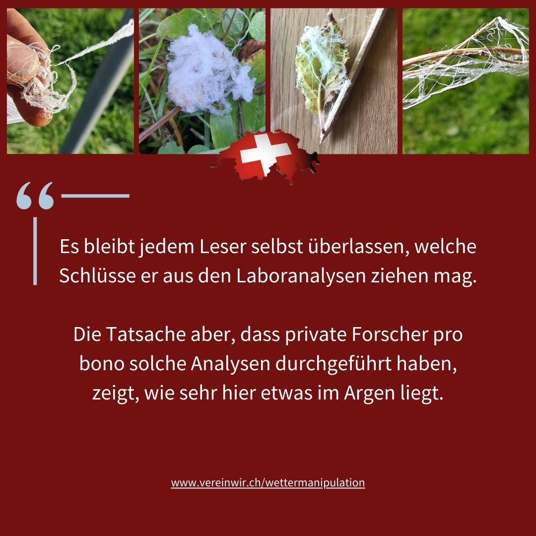 Die an diversen Orten (in der CH & EU-weit) gesammelten Faden-ähnlichen Materialien wurden mit «state of-the art» analytischen Untersuchungsmethoden unter die Lupe genommen. Basierend auf FTIR-(Fourier Transformations Infrarot) Spektroskopie und Pyrolyse-GC-MS (Gaschromatographie-Massenspektrometrie) Untersuchungen konnten wir nachweisen, dass die polymeren Fäden auf natürlichen Polyamiden/Oligopeptiden, ausgehend von mehreren Aminosäuren (evtl inkl. deren Derivate), aufgebaut sind. Evidenz für synthetischen Polyamiden wie z.B. PA6, PA66, PA12 etc. (Handelsprodukte wie Nylon o.ä.) oder andere Kunststoffen (PET, PE, PP…) können anhand der kombinierten Analysentechniken (FTIR-Spektroskopie, Pyrolyse-GC-MS) definitiv ausgeschlossen werden. In Pyrolyse-GC-MS Kontroll-Experimenten bei Vergleichsprodukten wie PA 6 (Nylon) wurde das Edukt Caprolactam eindeutig nachgewiesen, was in keinem der Fadenmaterialien gefunden wurde – ebenso kein anderes Edukt von synthetischen Fasern. Zusätzlich ergab die Elementanalytik mit ICP-MS (Inductively Coupled Plasma Mass Spectrometrie) neben den Schlüsselelementen C (Kohlenstoff), H (Wasserstoff), N (Stickstoff) auch S (Schwefelstoff), wie er in der Aminosäure Cystein oder Methionin enthalten ist. Metalle wurden nur in Spuren nachgewiesen ausser etwas erhöhtem Aluminiumwert.